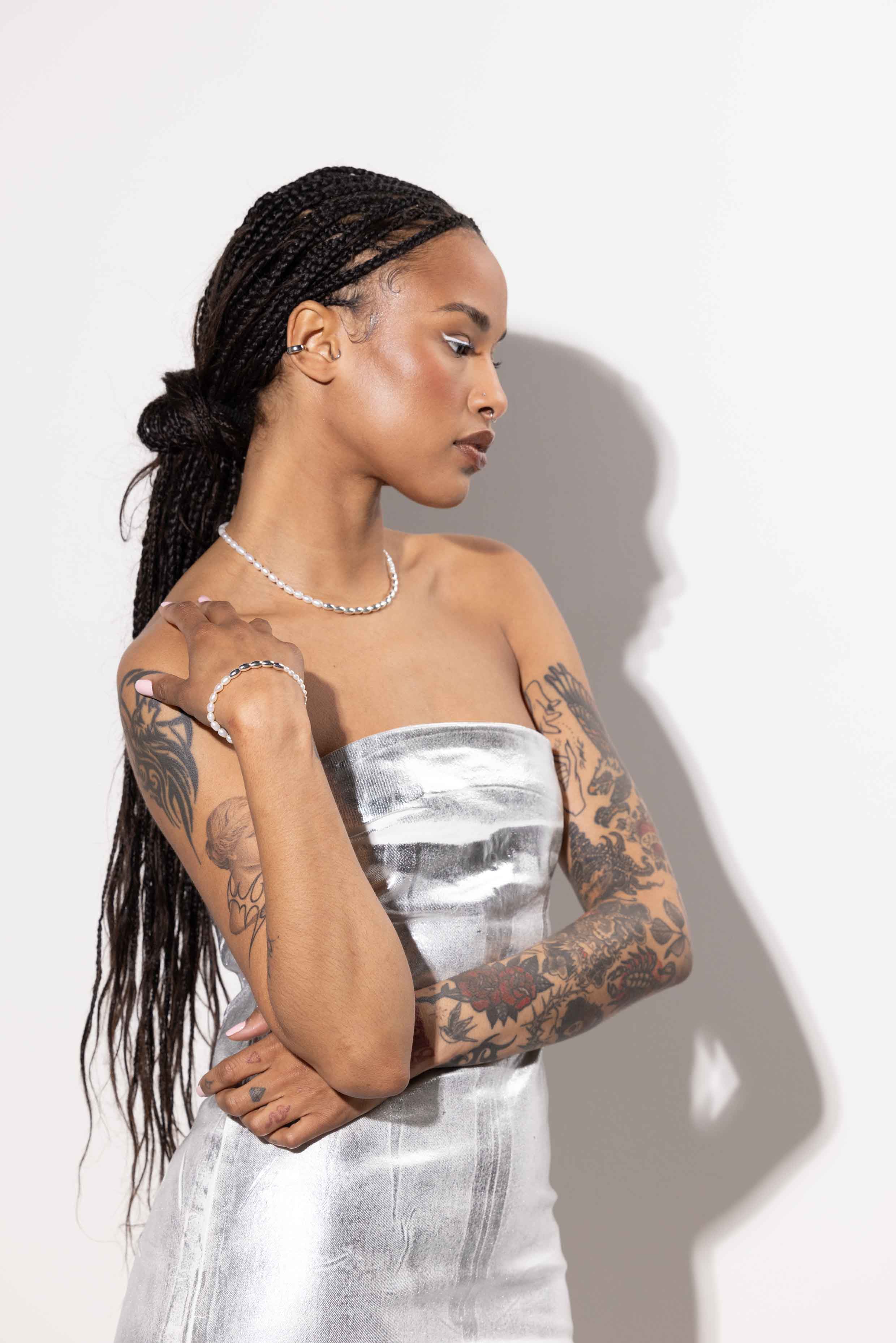 Our sterling silver pieces are crafted from 92.5% pure silver and plated in rhodium or 18k gold for added tarnish resistance and a refined finish. Each item is stamped 925 to mark its quality and authenticity.