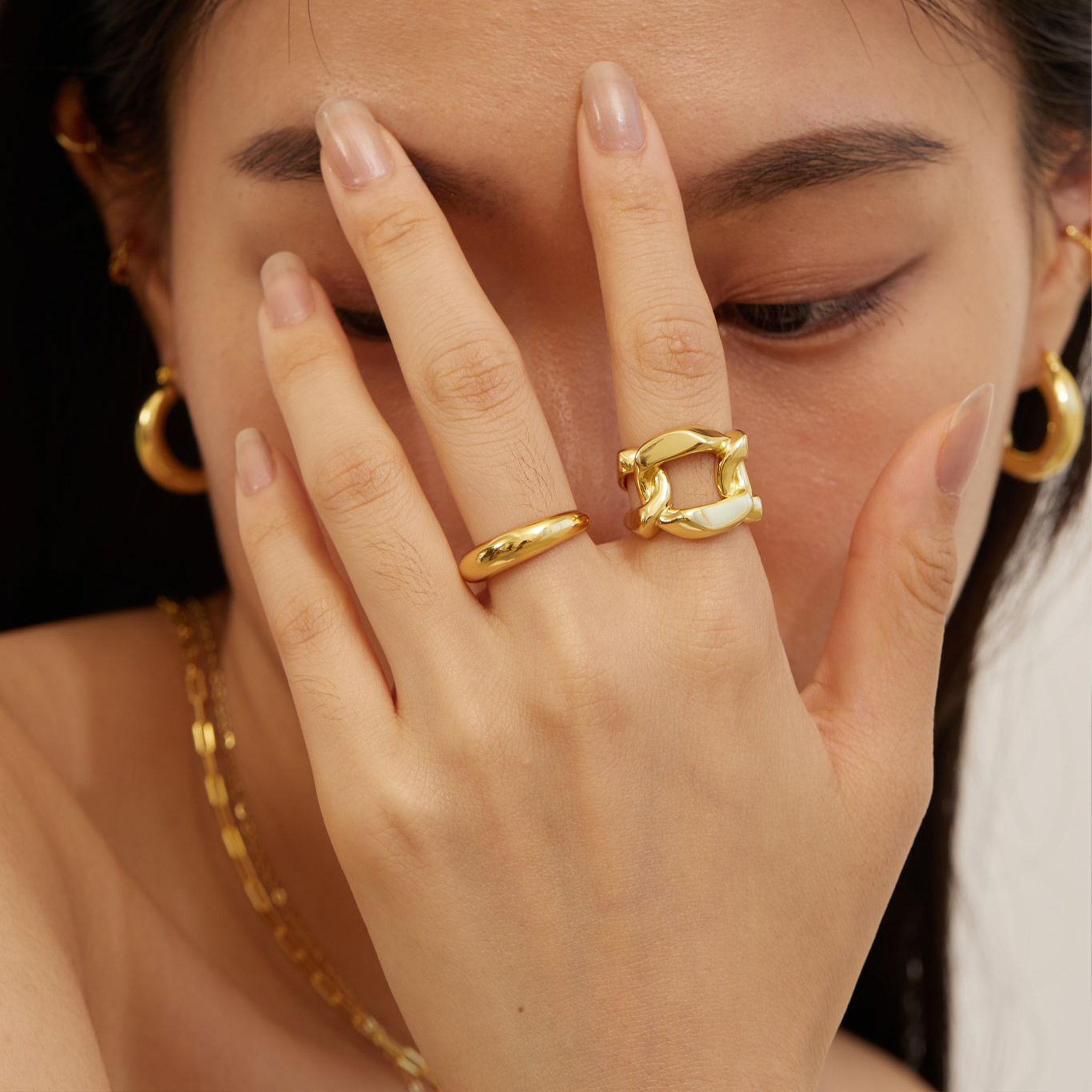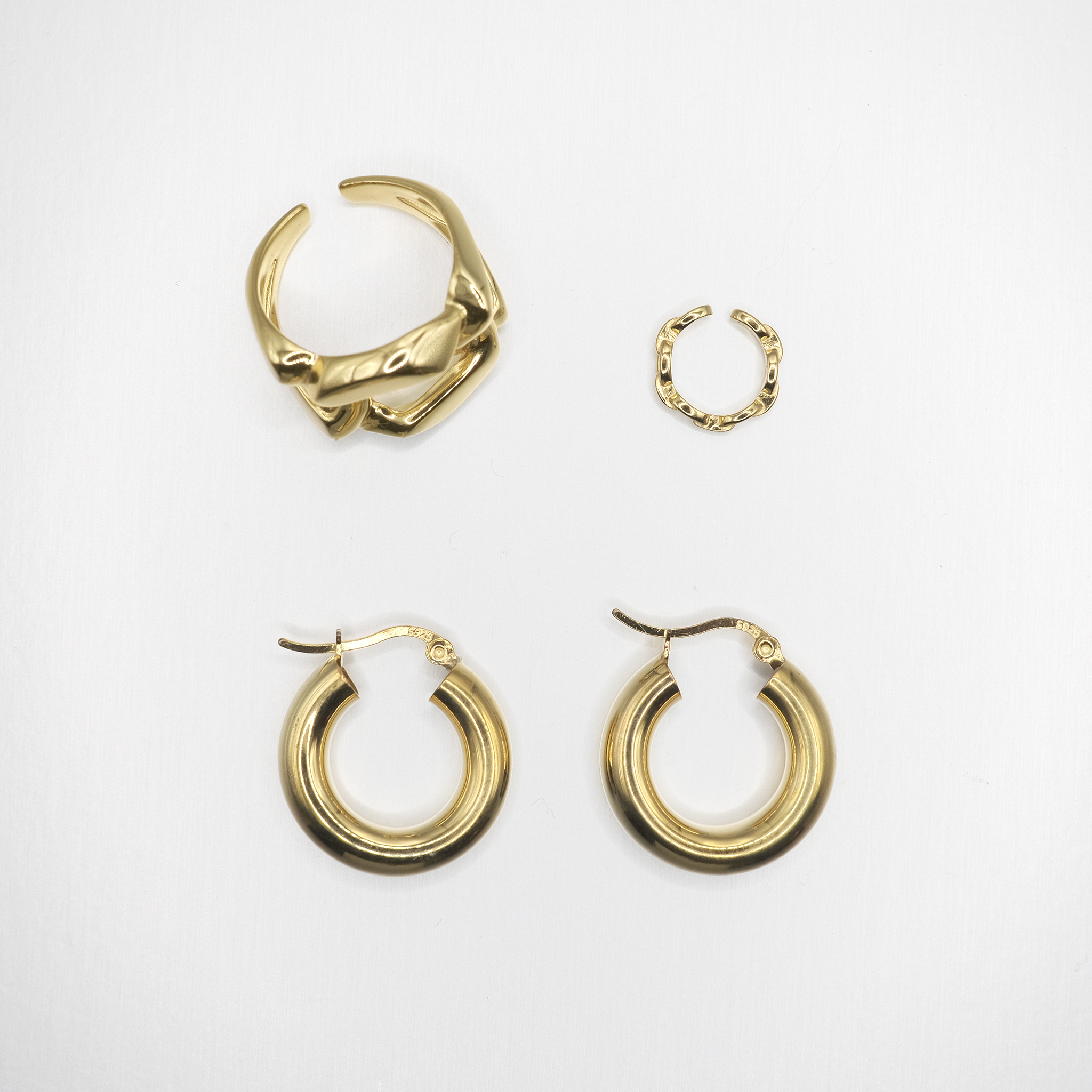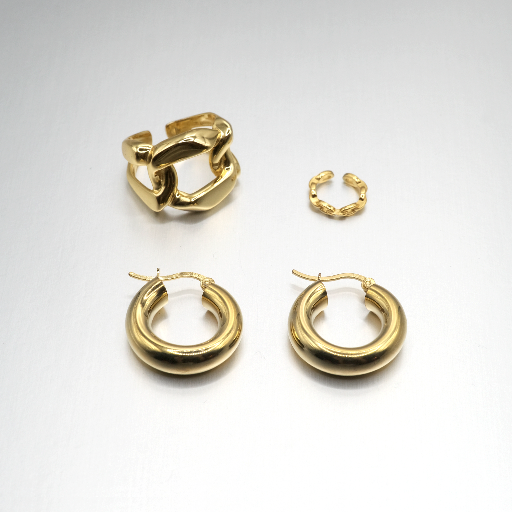 A curated trio of bold gold essentials — the Chain Ring, Chunky Hoops, and Chain Ear Cuff — designed for the woman who leads with effortless charisma. Confident, striking, and unmistakably in command.