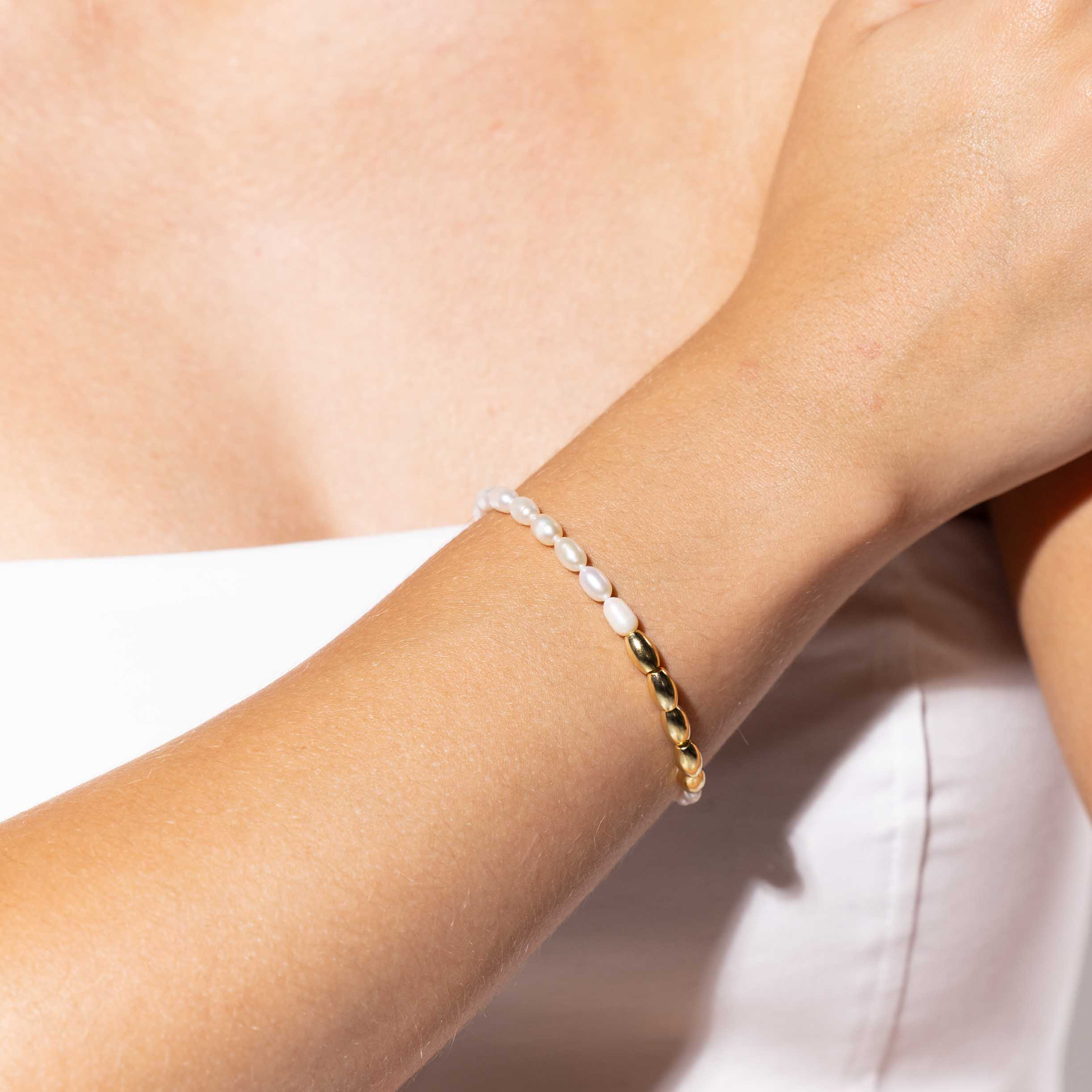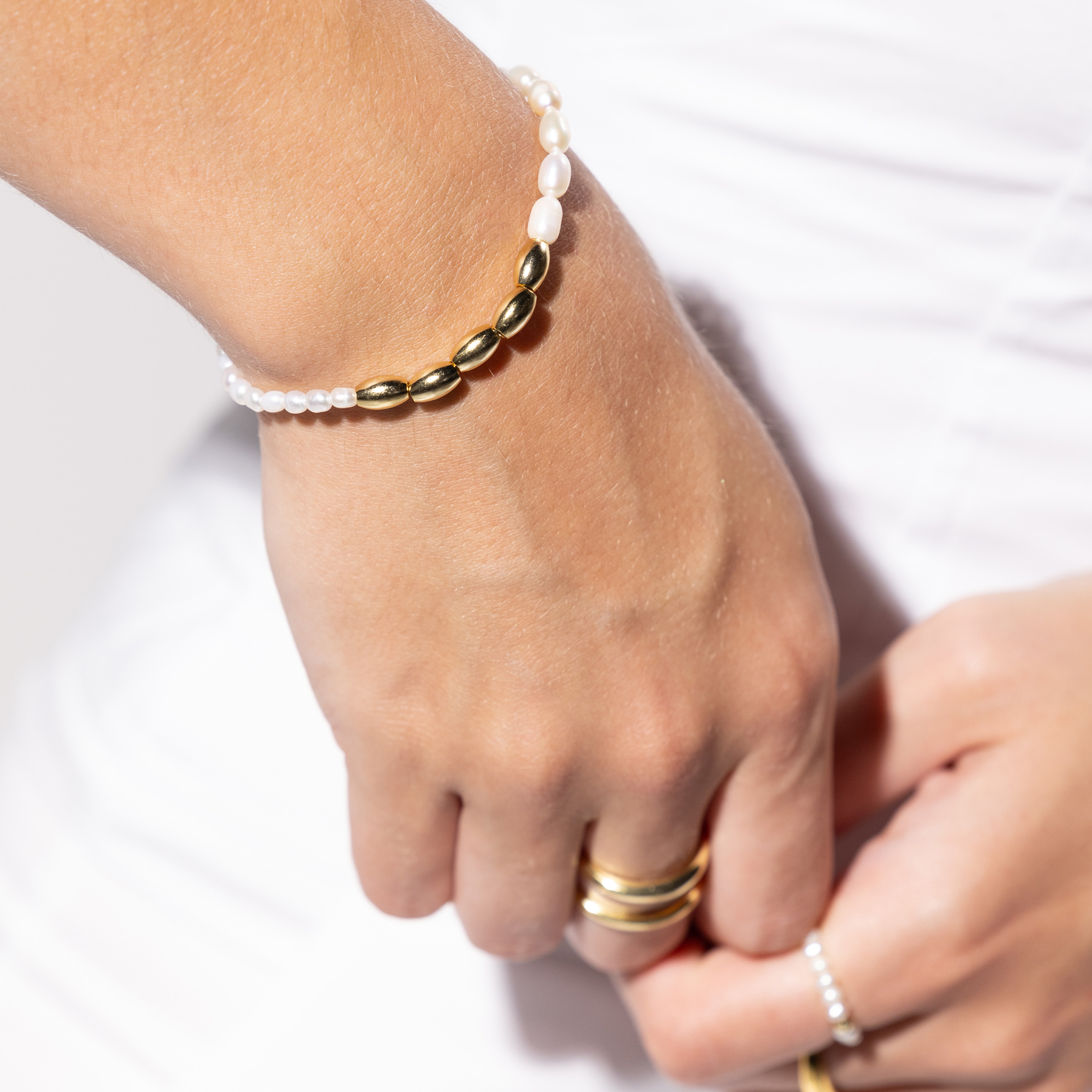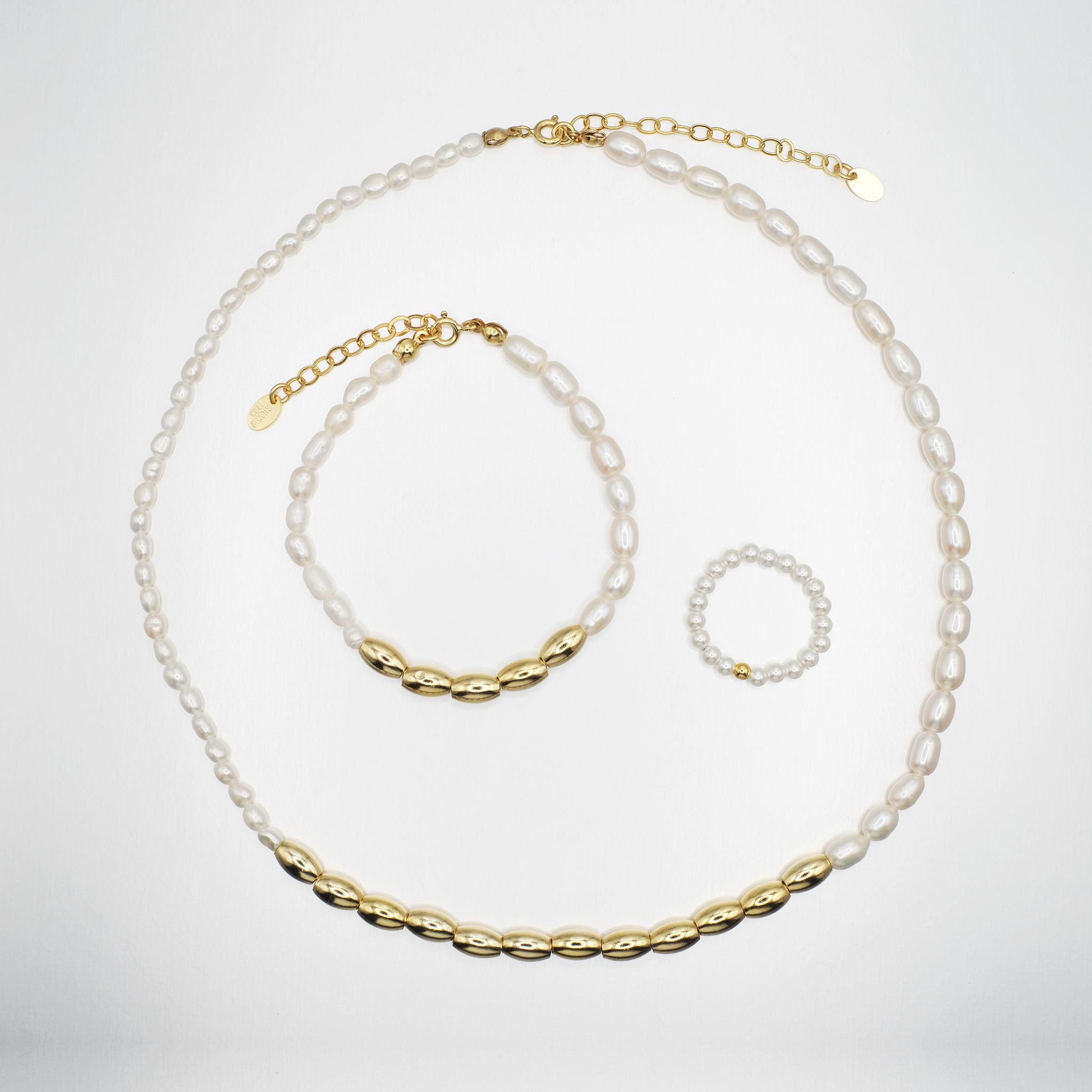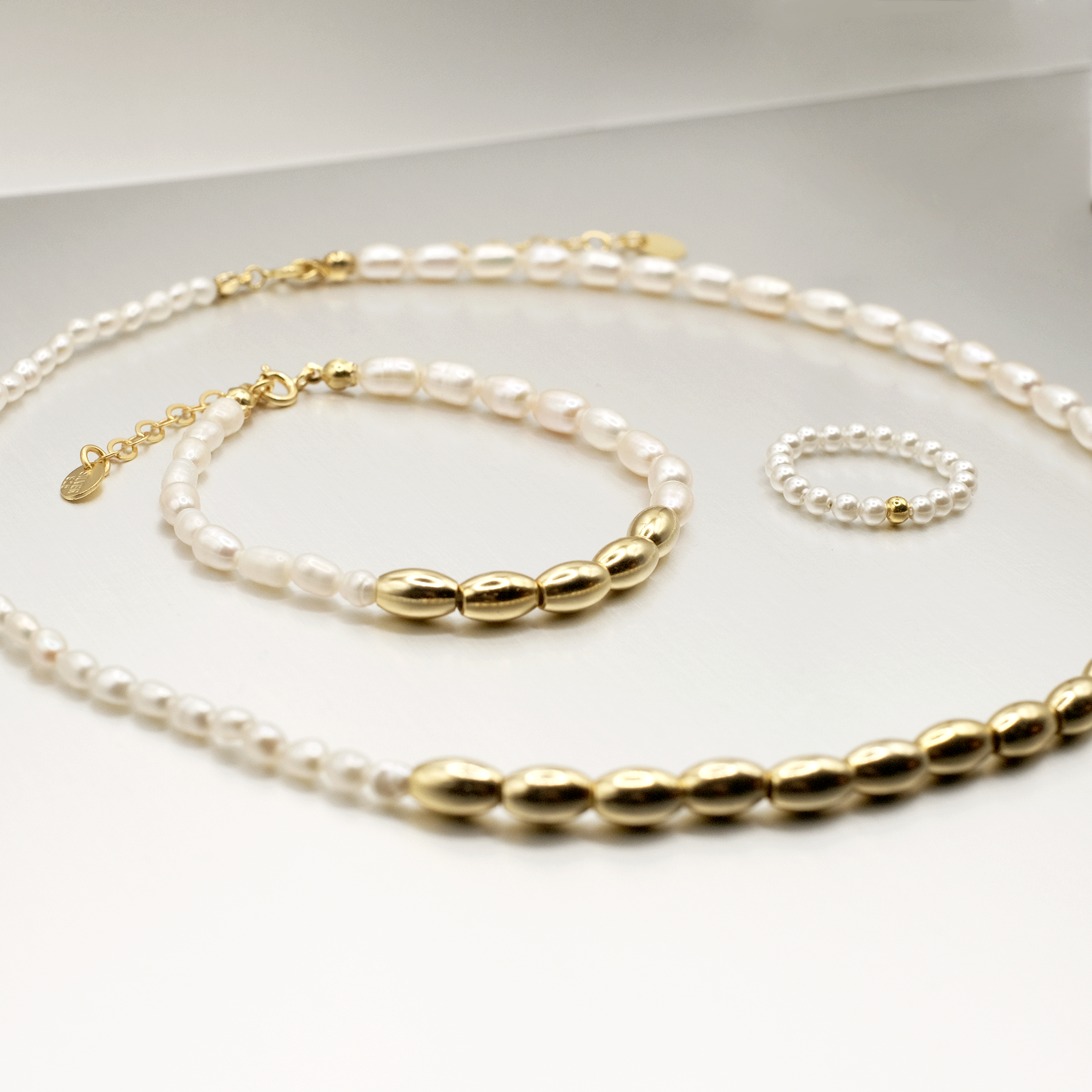 A soft, luminous trio with an 18k gold shine — a Gold-Dipped Freshwater Pearl Necklace, Stretch Ring, and Bracelet. Effortless pieces that glow with her energy and elevate every moment she touches.